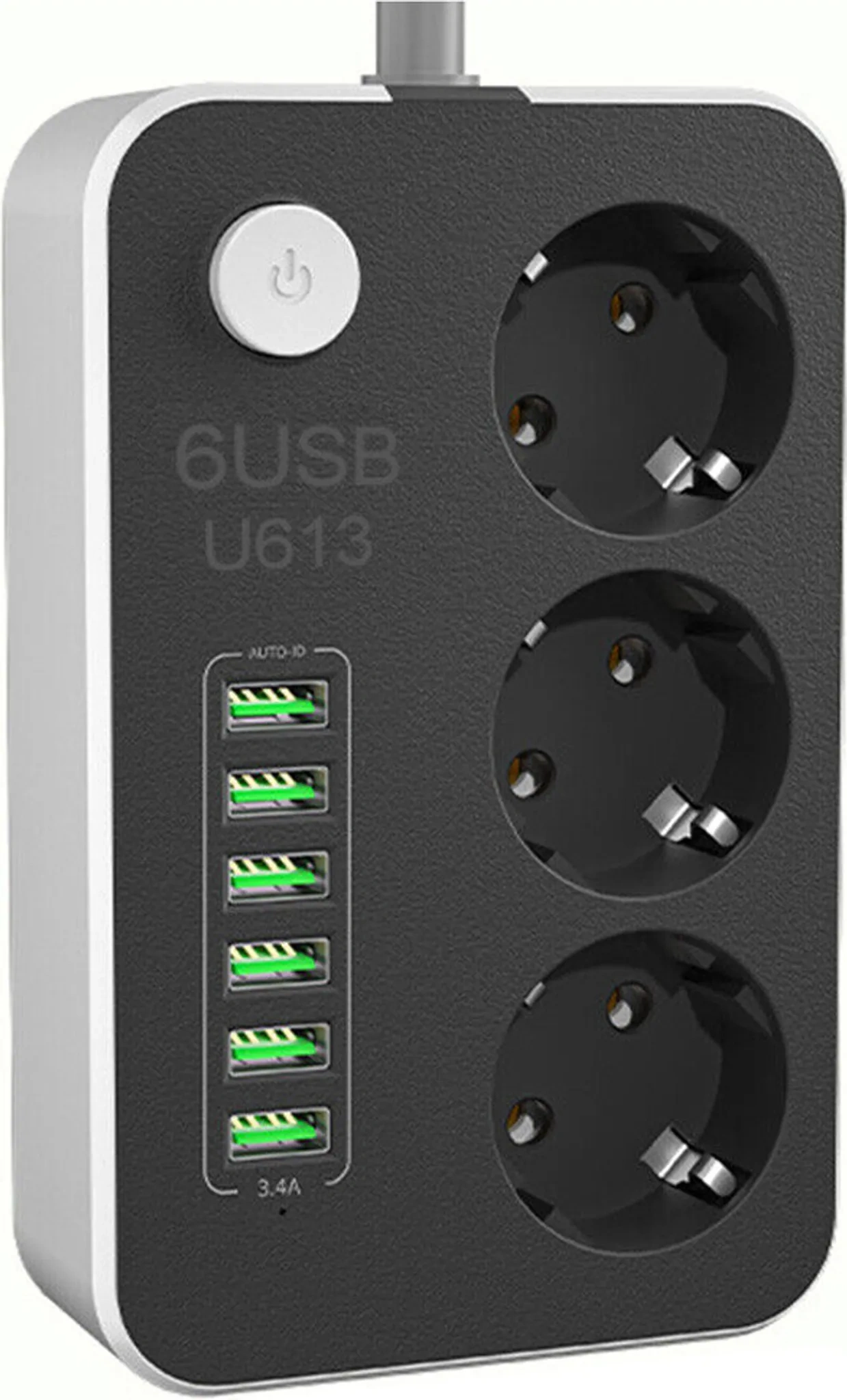 3-fach Steckdosenleiste mit 6 USB-Ports – Modell A66C, Schwarz-Grau