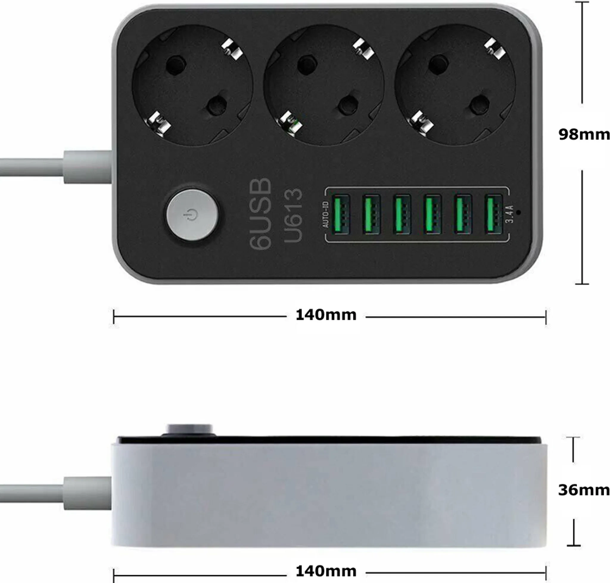 Diese kompakte Tisch-Steckdosenleiste mit drei AC-Steckplätzen und sechs USB-Anschlüssen eignet sich ideal für Schreibtische, Wohnzimmer, Arbeitsbereiche oder Werkstätten. Dank intelligenter USB-Erkennung werden angeschlossene Geräte automatisch erkannt und mit optimaler Ladeleistung versorgt – sicher, effizient und bequem.