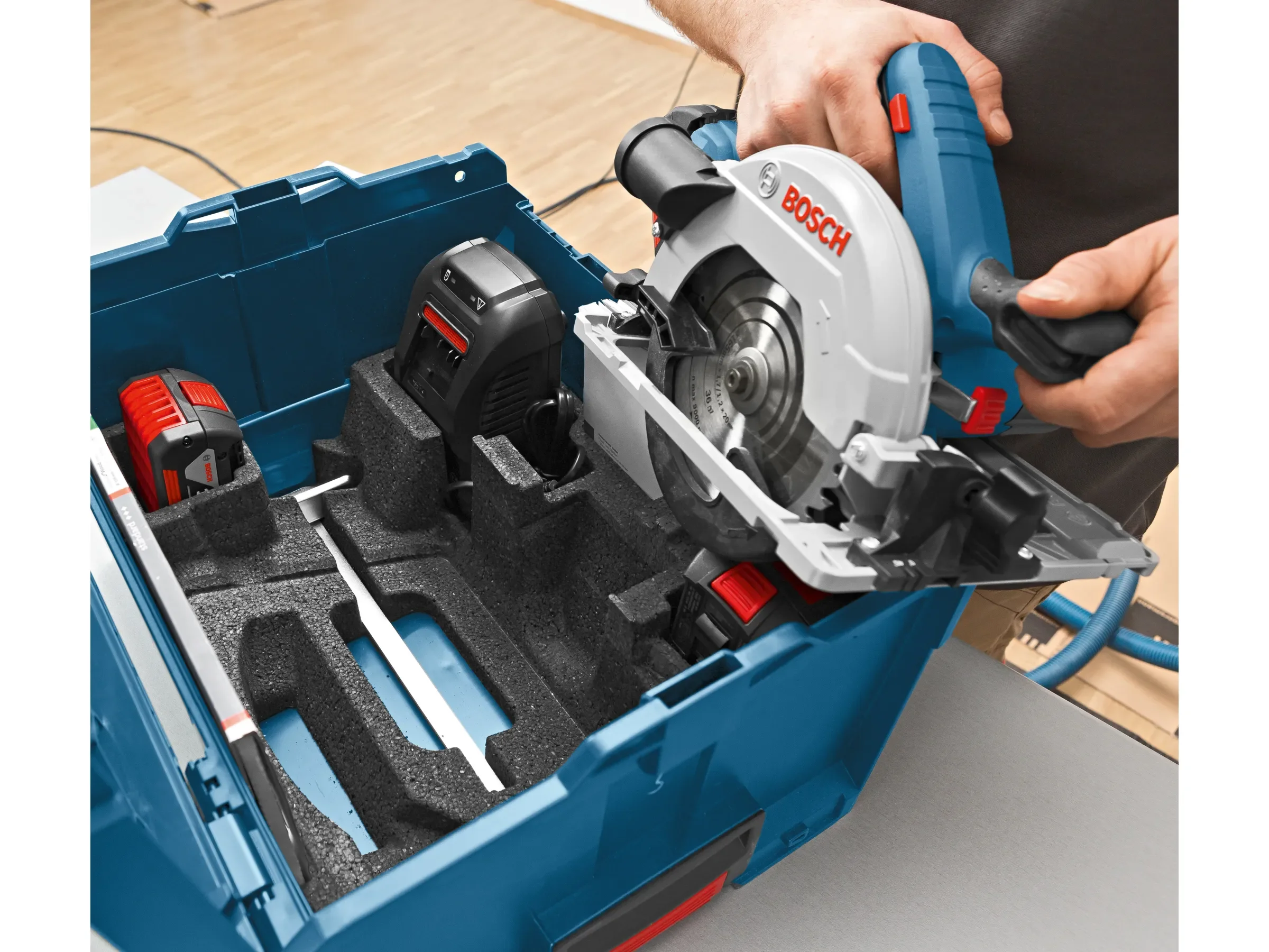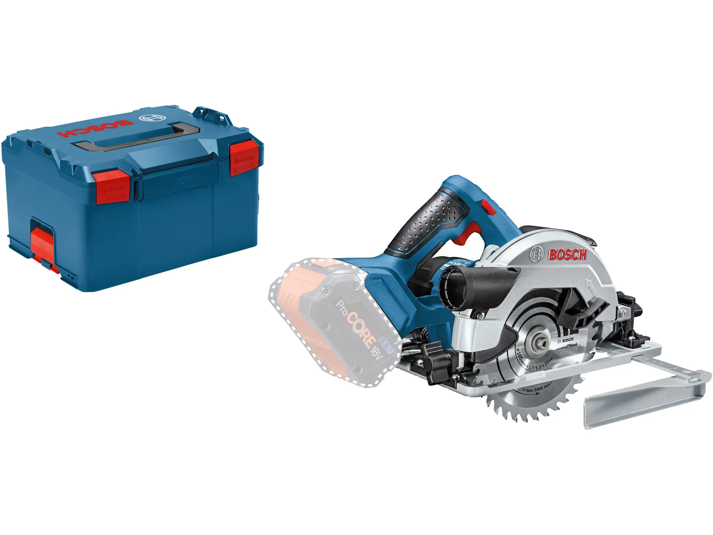 | Im Paket | 1 × Akku-Kreissäge • 1 × Kreissägeblatt (165 mm) • 1 × Parallelanschlag • 1 × Absaugadapter • 1 × Innensechskant • 1 × L-Boxx mit Einlage |