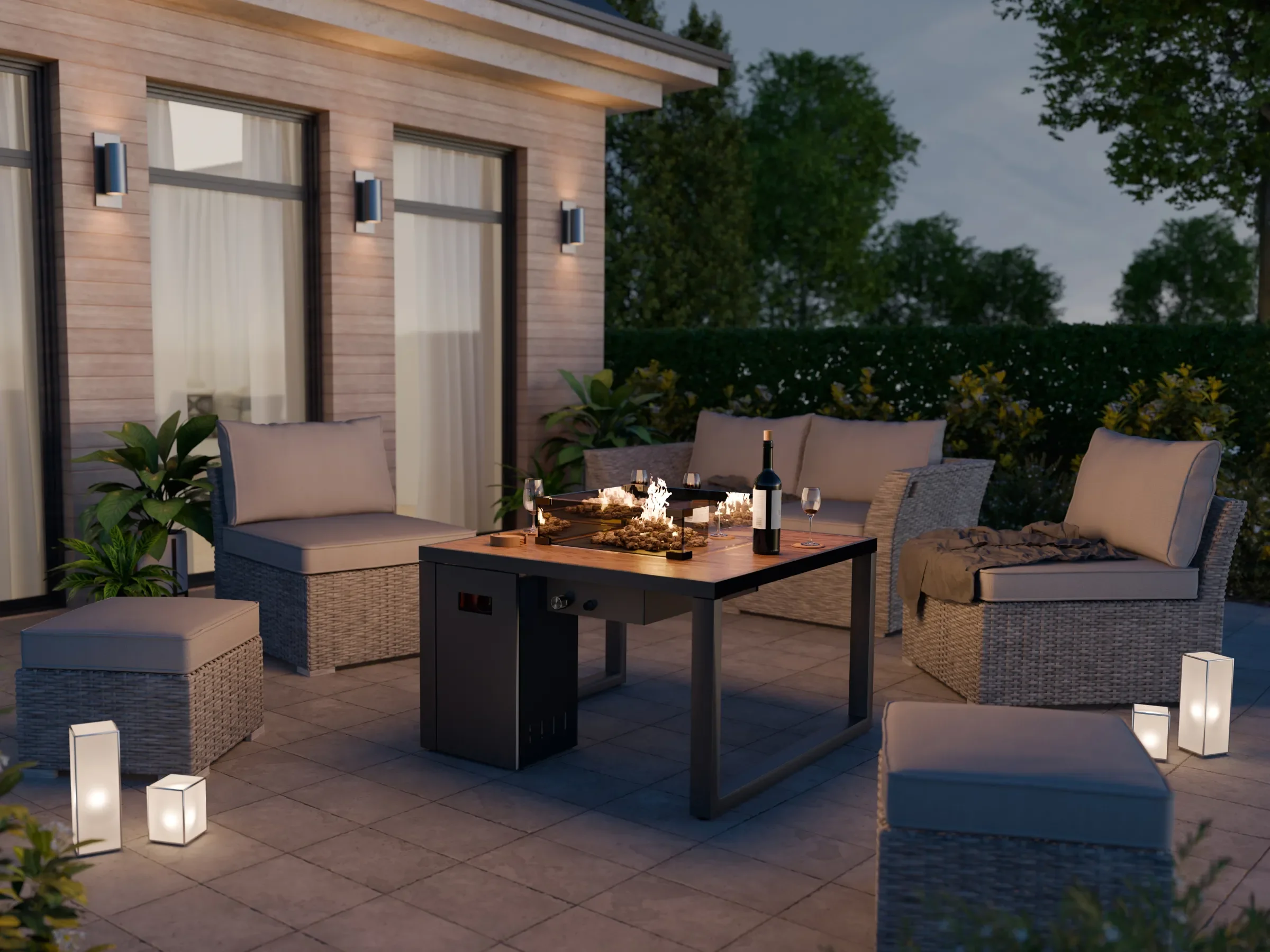 Der Lounge-Feuertisch verbindet modernes Design mit funktionaler Wärmequelle für Außenbereiche. Die großzügige Tischfläche mit Keramikfliesen in Holzoptik schafft eine elegante Lounge-Atmosphäre und bietet gleichzeitig ausreichend Platz für Getränke oder Dekoration.