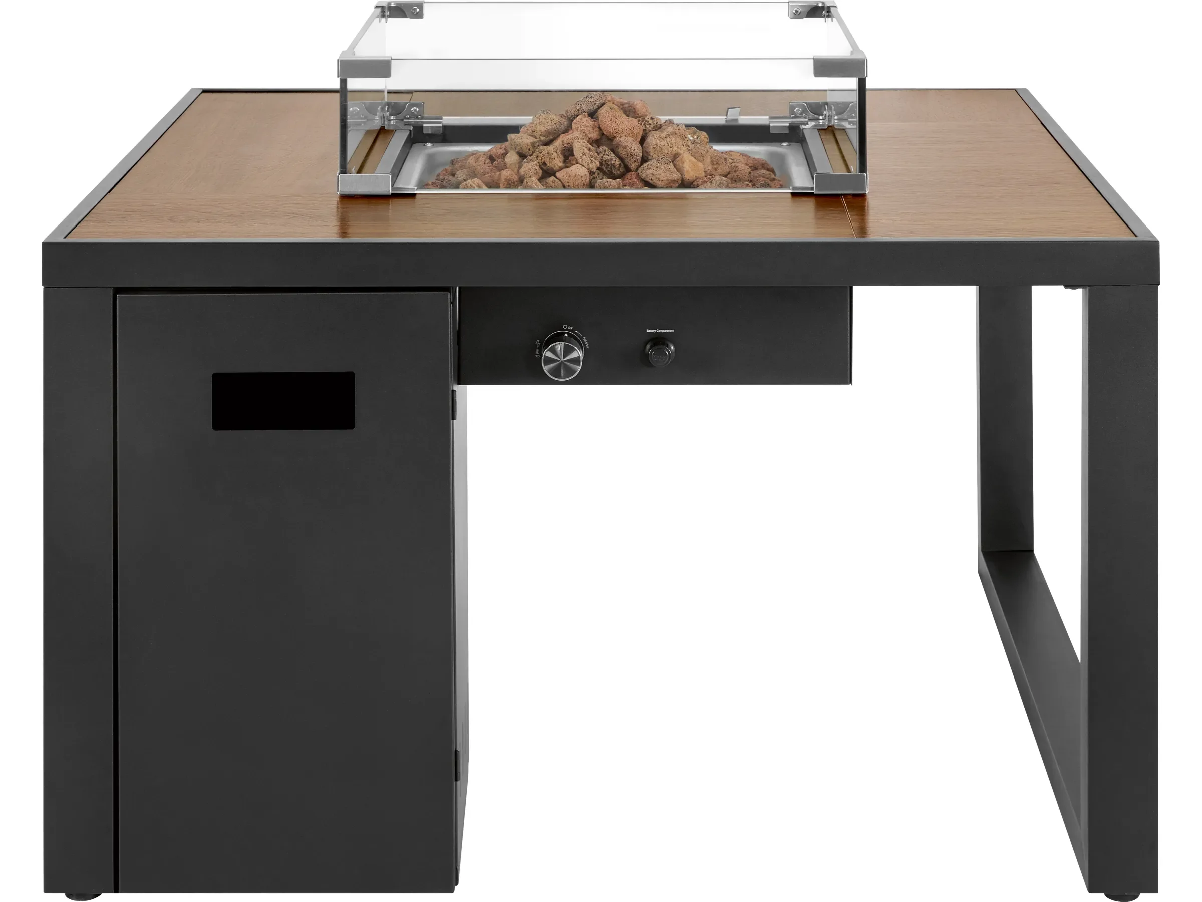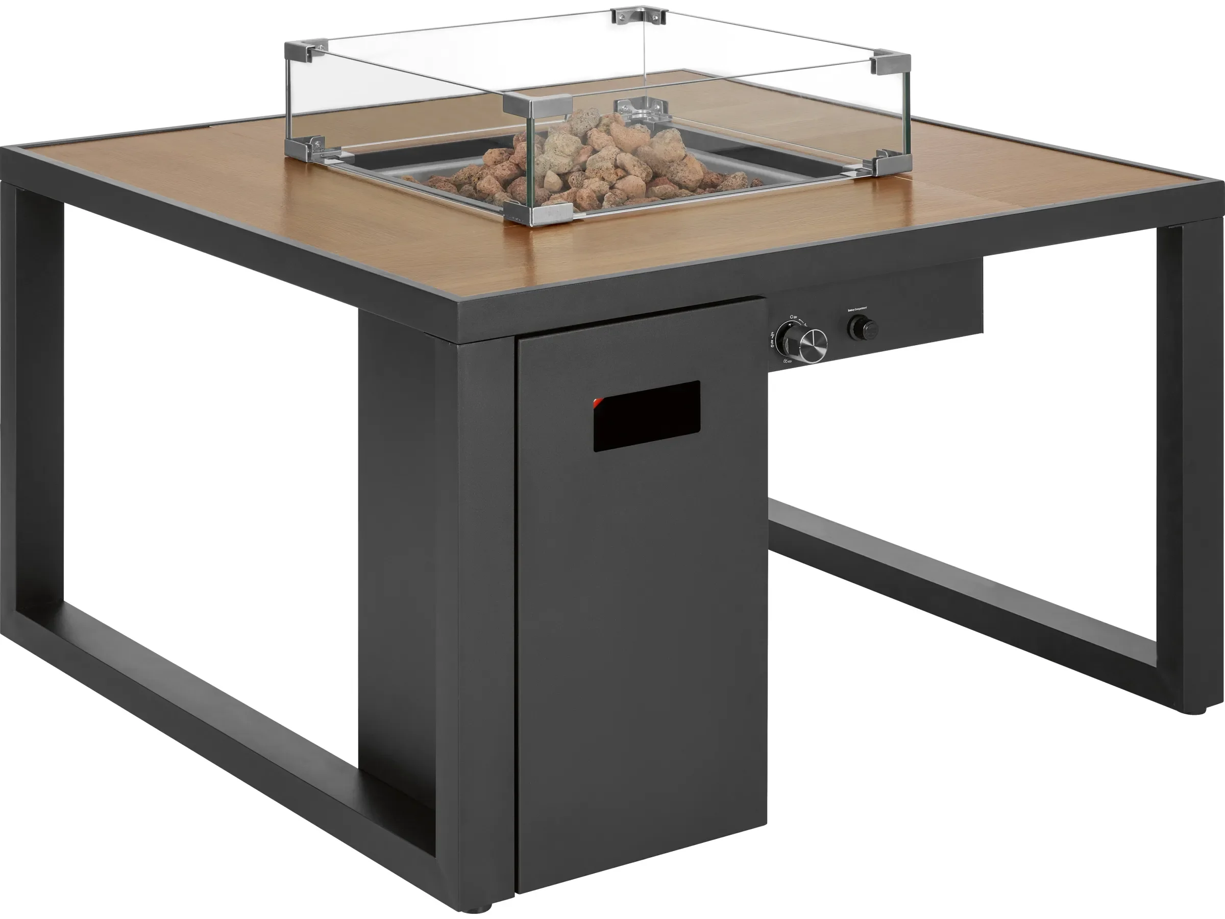 Highlights: Großzügige Keramik-Tischfläche in Holzoptik, regulierbarer Ringbrenner mit hoher Wärmeleistung, dekorative Lavasteine, Glas-Windschutz für ruhiges Flammenbild, integrierter Stauraum für Gasflasche.