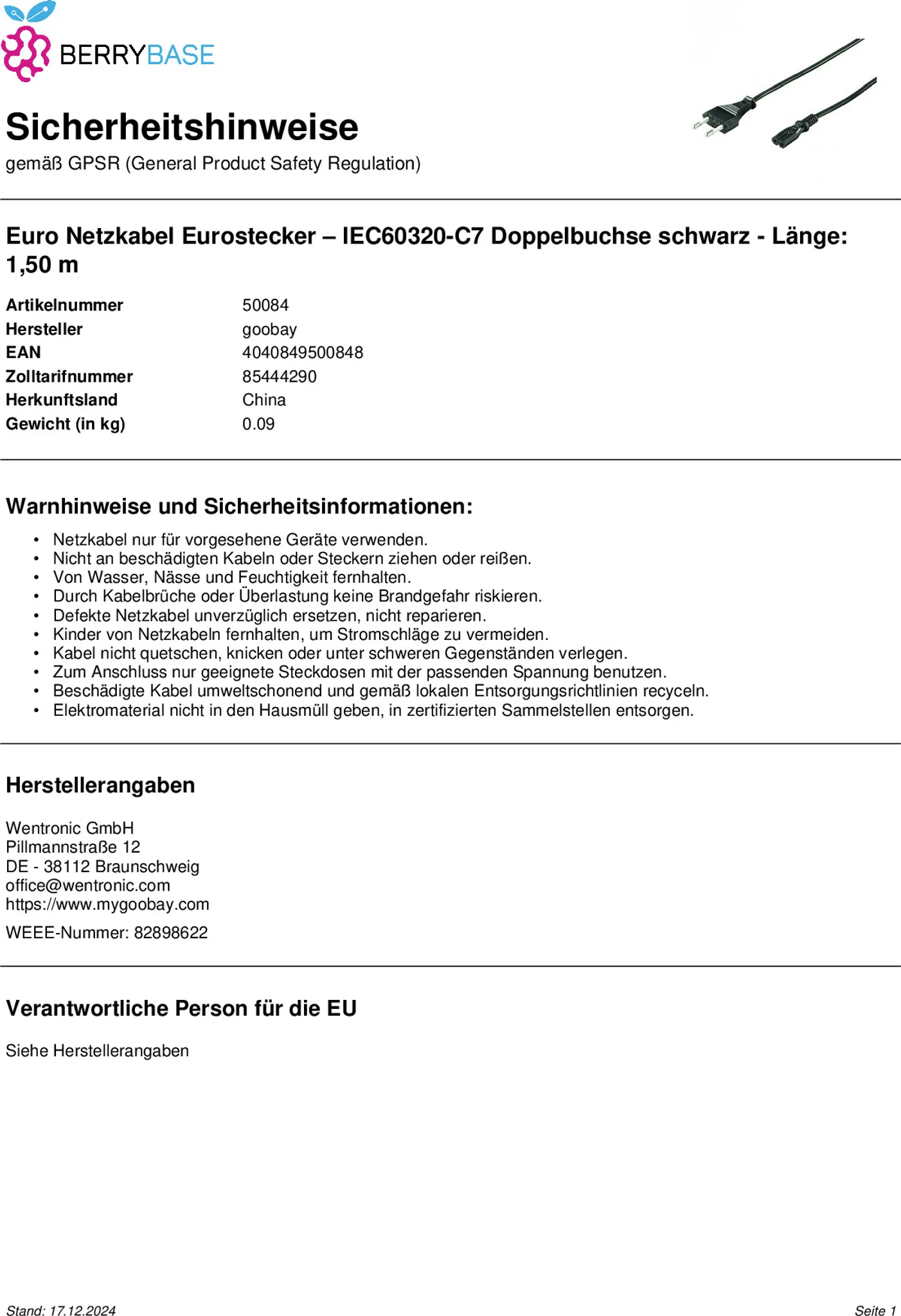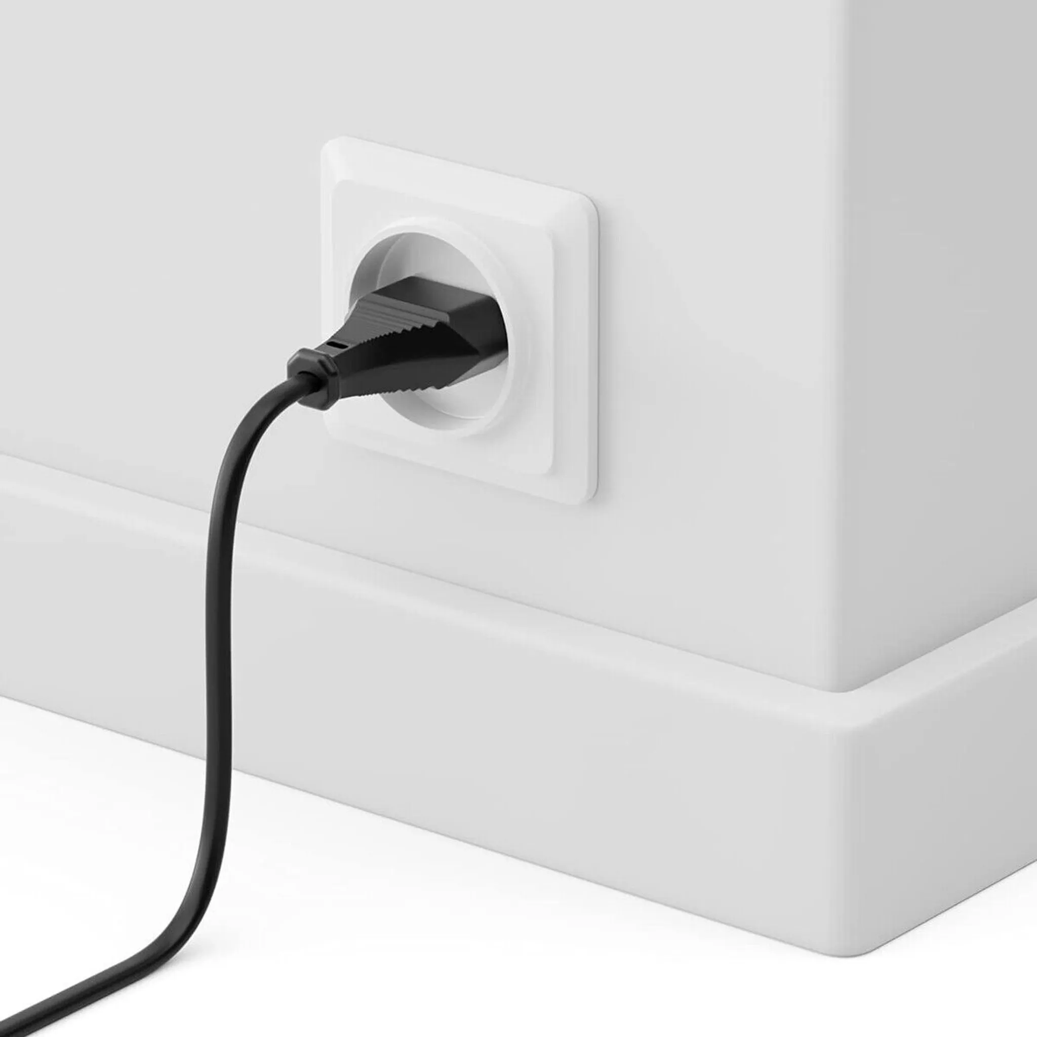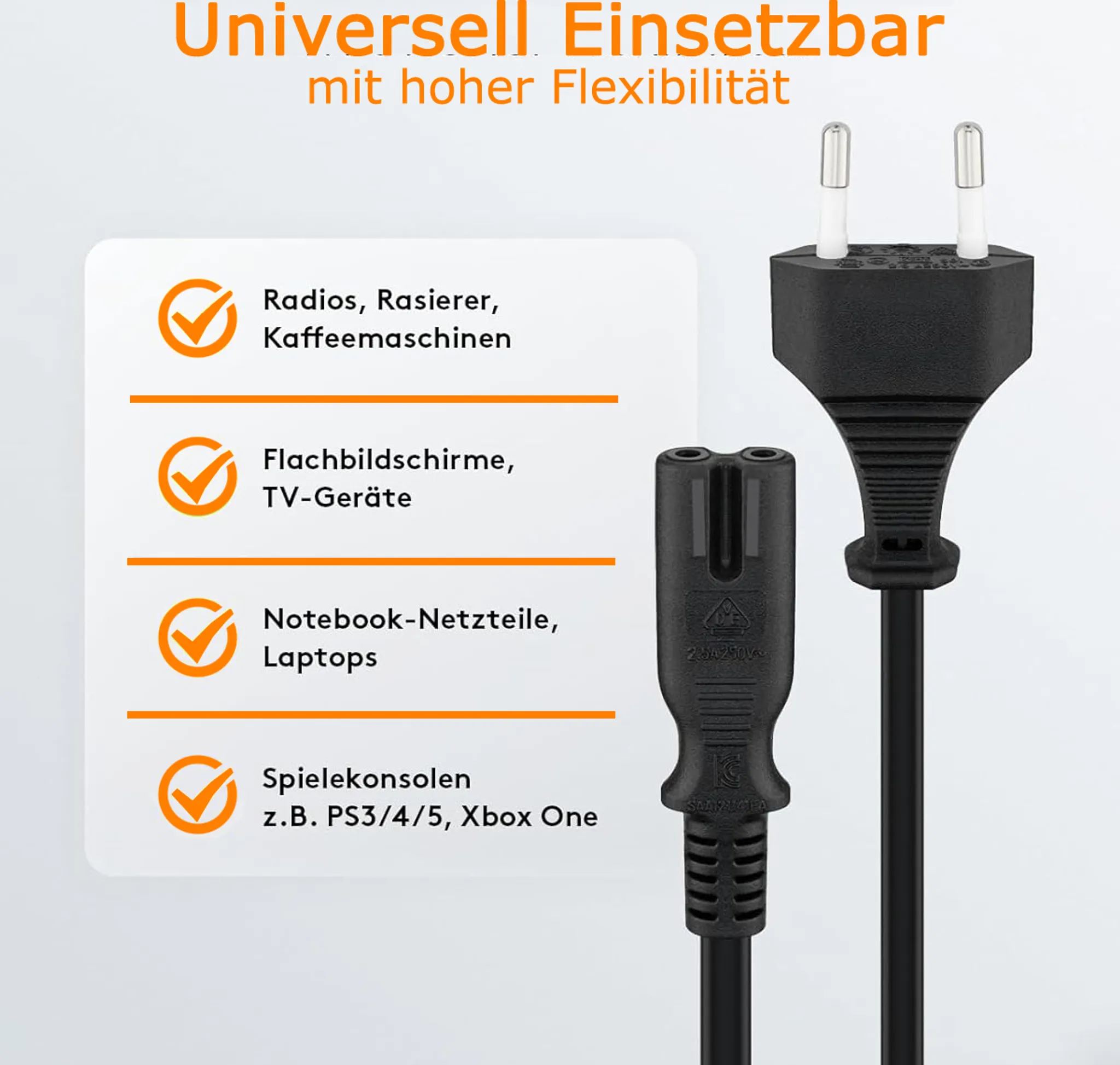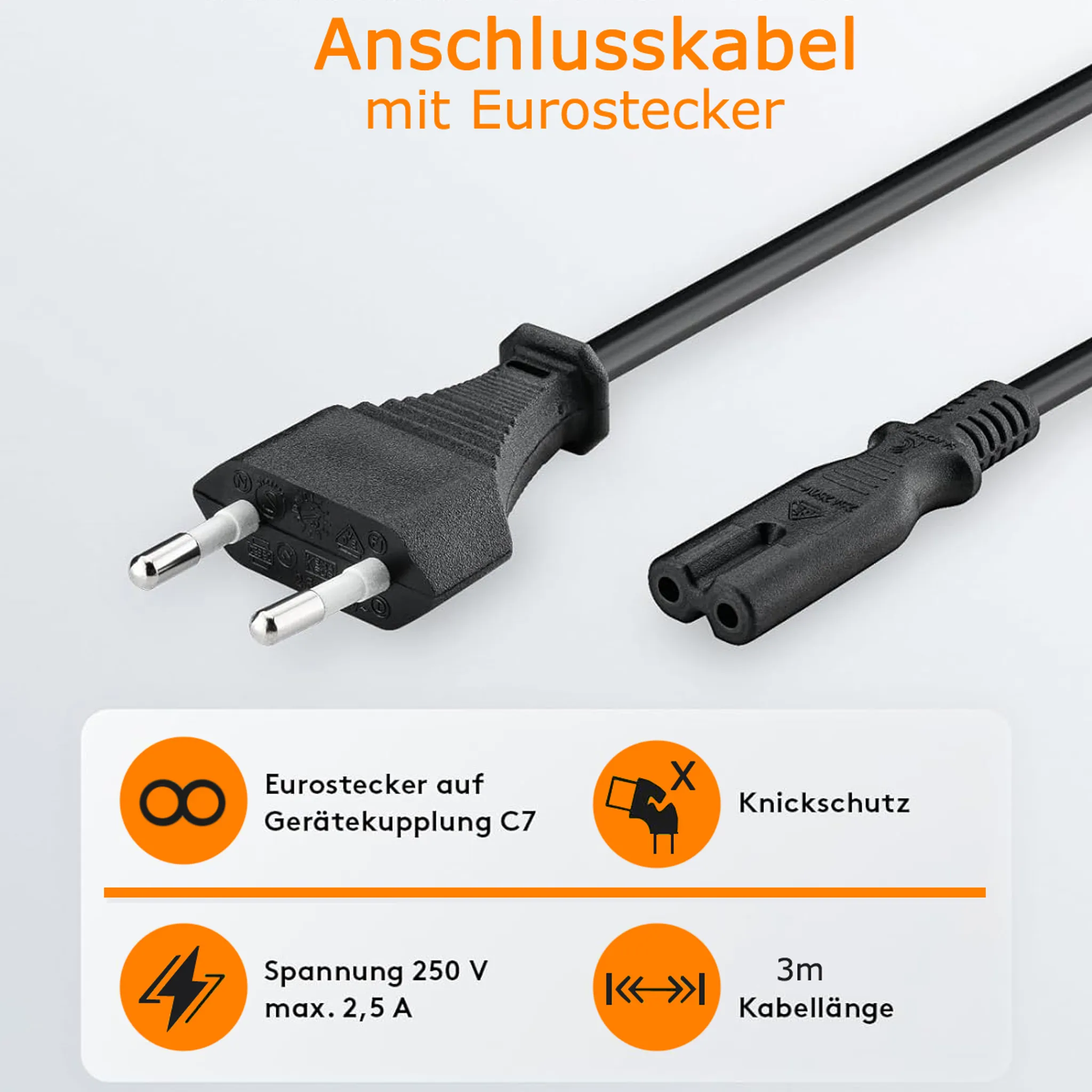 Der Eurostecker (CEE 7/16) und die Gerätebuchse C7 gewährleisten eine sichere und stabile Verbindung. Die flexible PVC-Leitung (H03VVH2-F2) ist für leichte mechanische Belastungen geeignet.