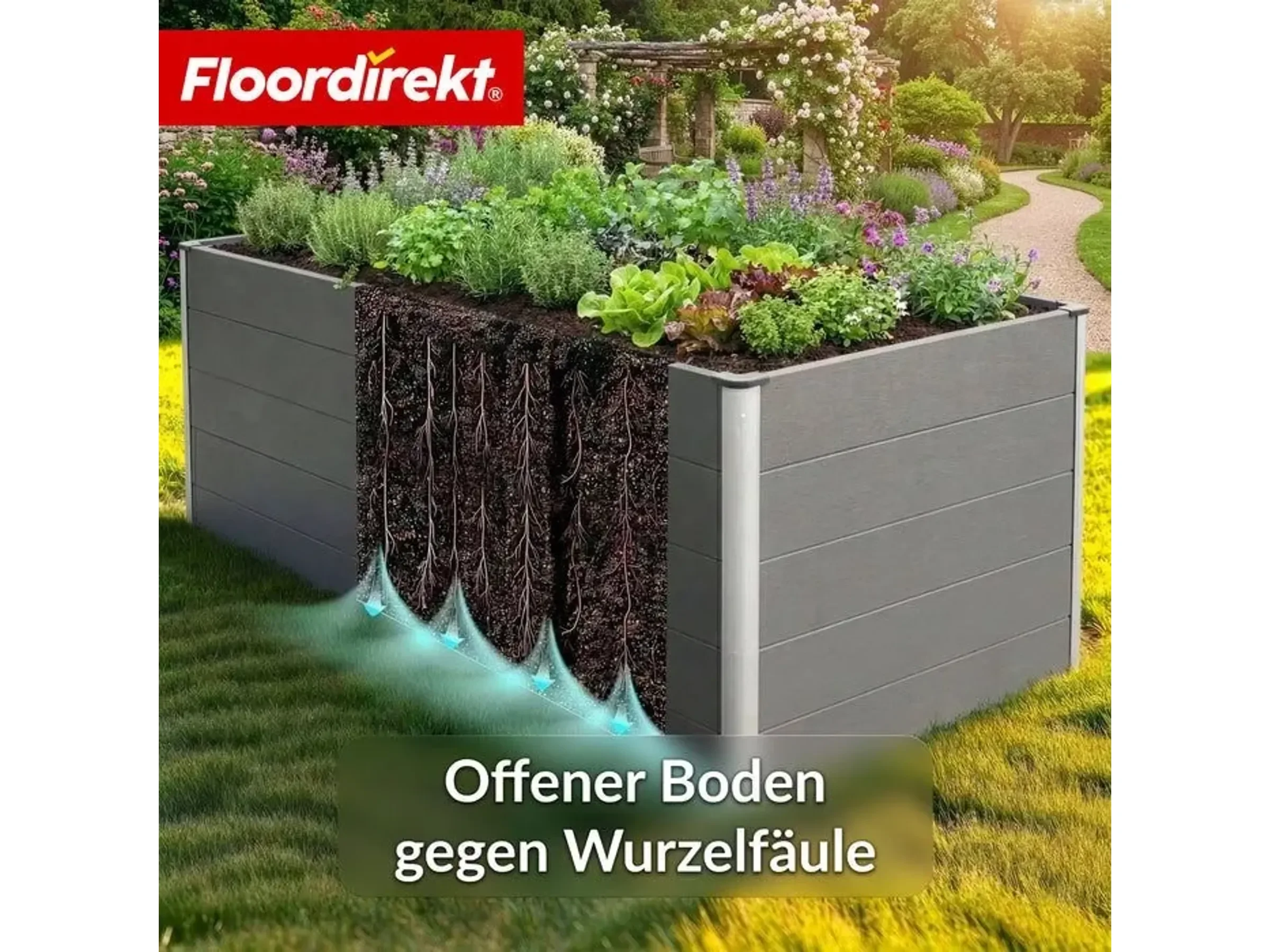 Gefertigt aus langlebigem WPC in Kombination mit Stahl und Aluminium überzeugt die Konstruktion durch Formstabilität, Witterungsbeständigkeit und geringen Pflegeaufwand. Die erhöhte Bauweise ermöglicht komfortables, rückenschonendes Arbeiten, während der offene Boden eine natürliche Drainage unterstützt und Staunässe reduziert.