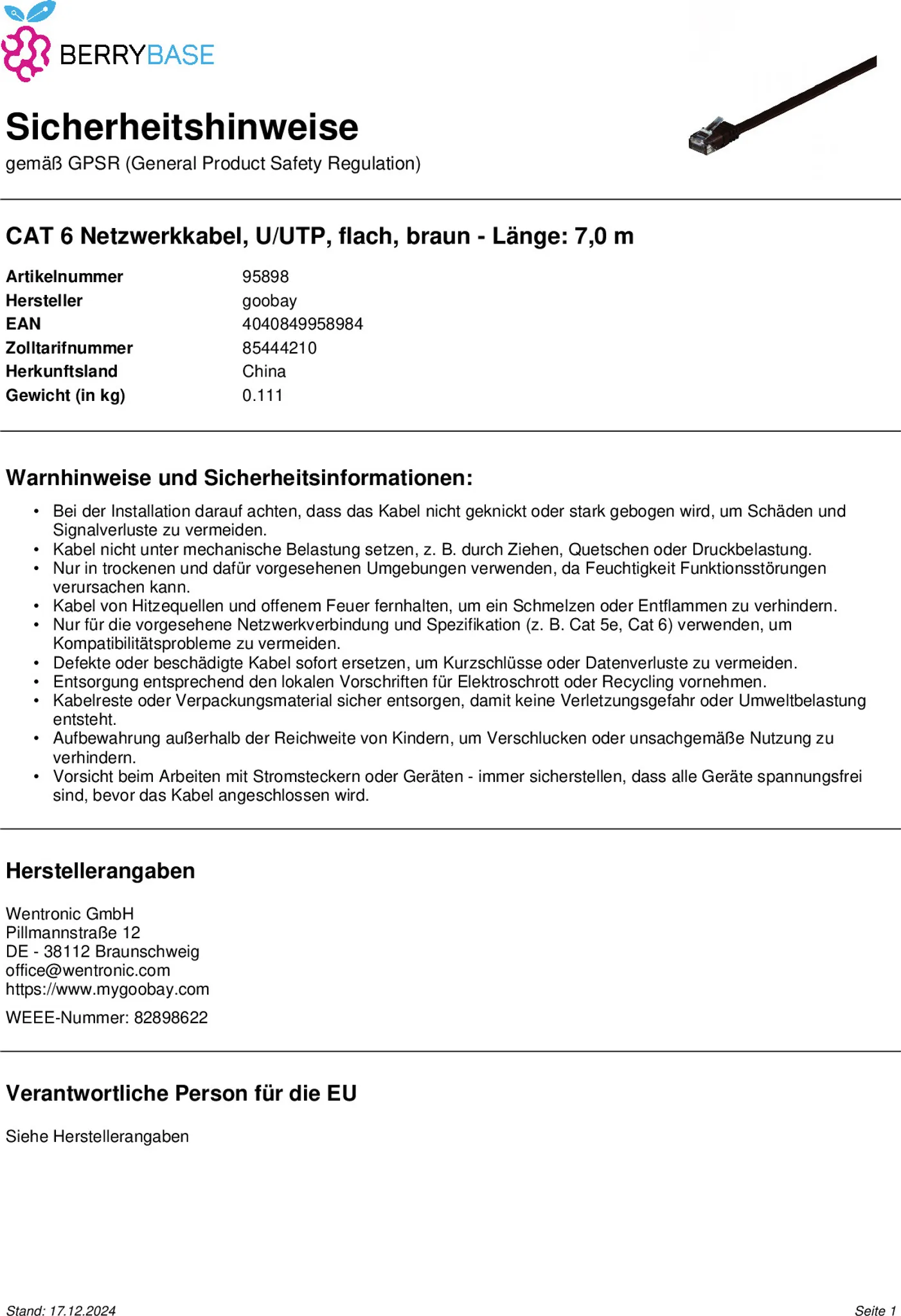 | Inhalt | 1× CAT 6 Flach-Patchkabel (7 m, dunkelbraun) |
