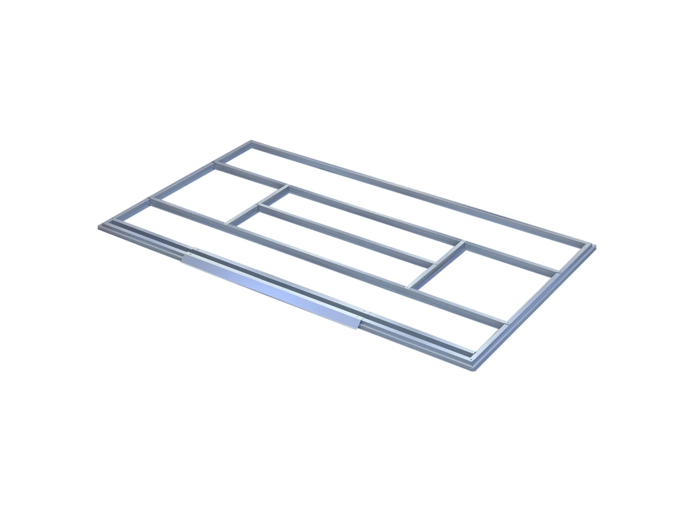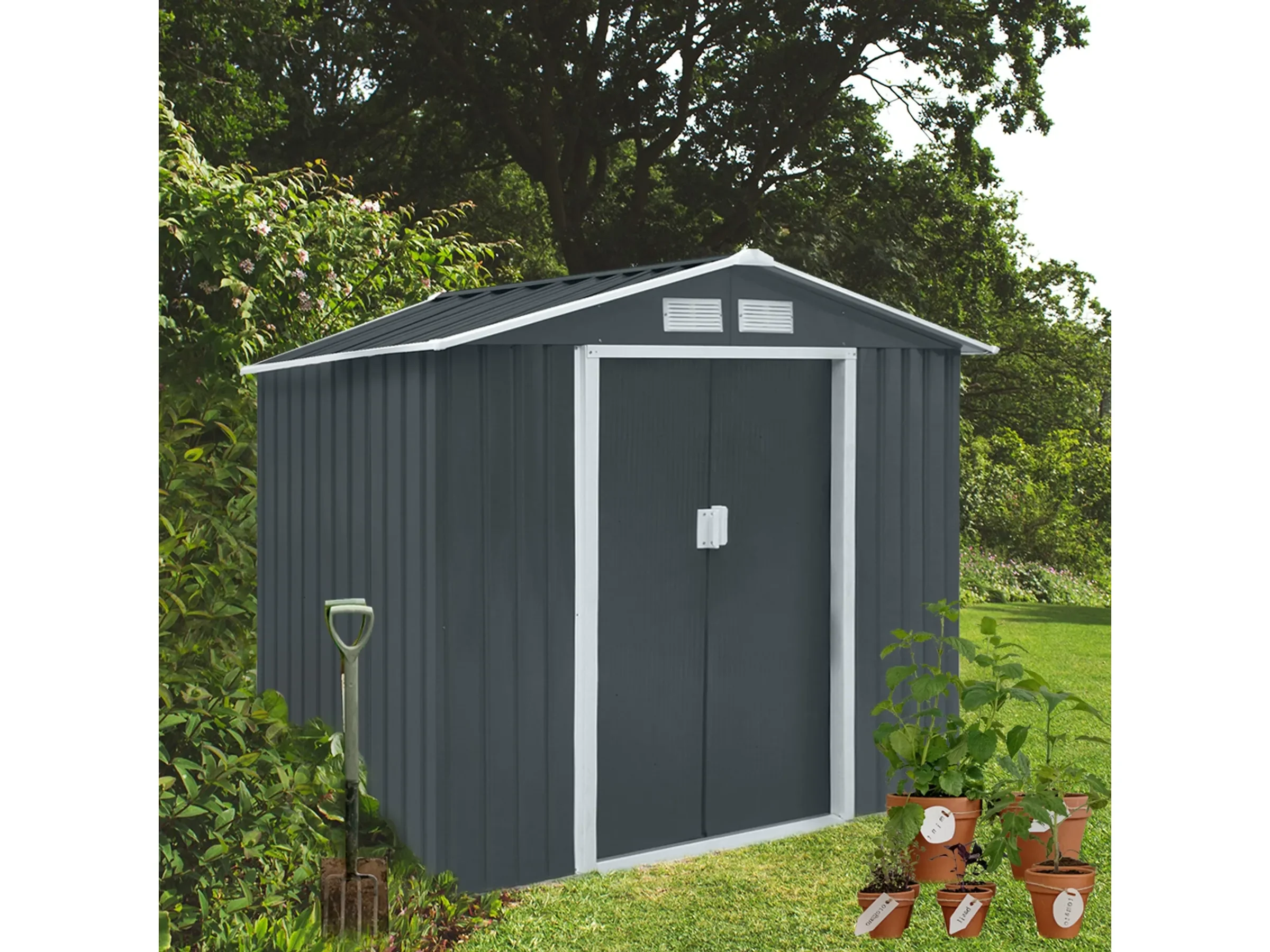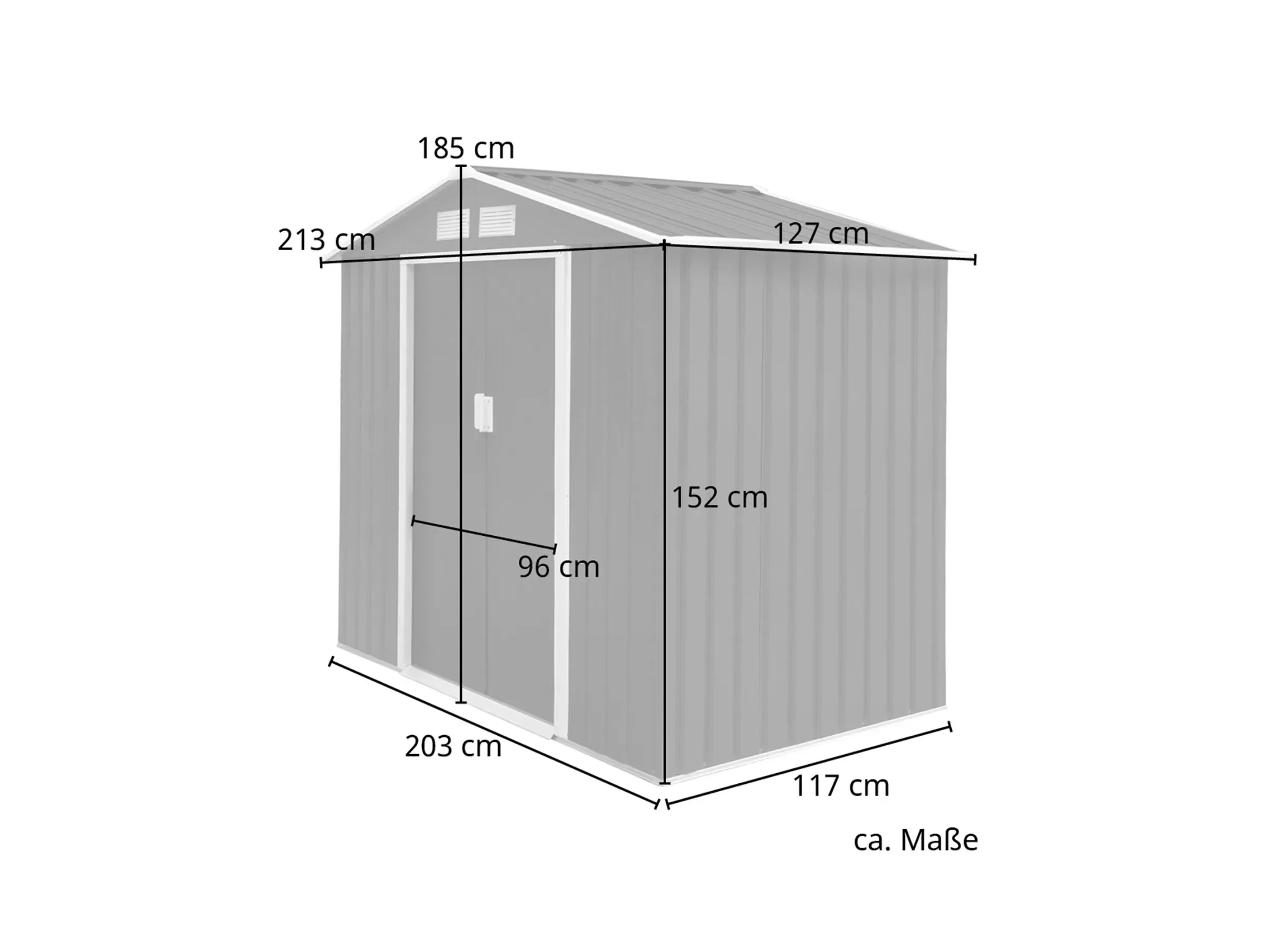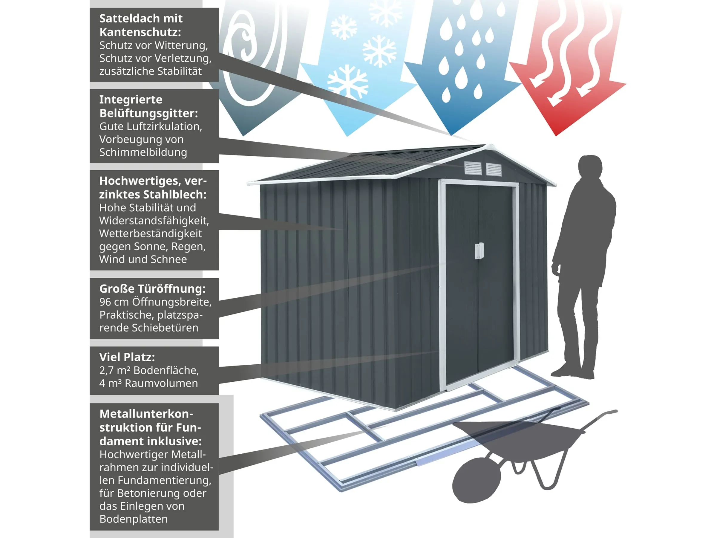 Die weit öffnenden Doppel-Schiebetüren ermöglichen einfachen Zugang zu größeren Geräten. Belüftungsgitter sorgen für Luftzirkulation, reduzieren Feuchtigkeit und beugen Schimmelbildung vor. Das Satteldach leitet Niederschlag zuverlässig ab und der mitgelieferte Fundament-Rahmen garantiert einen stabilen Stand.