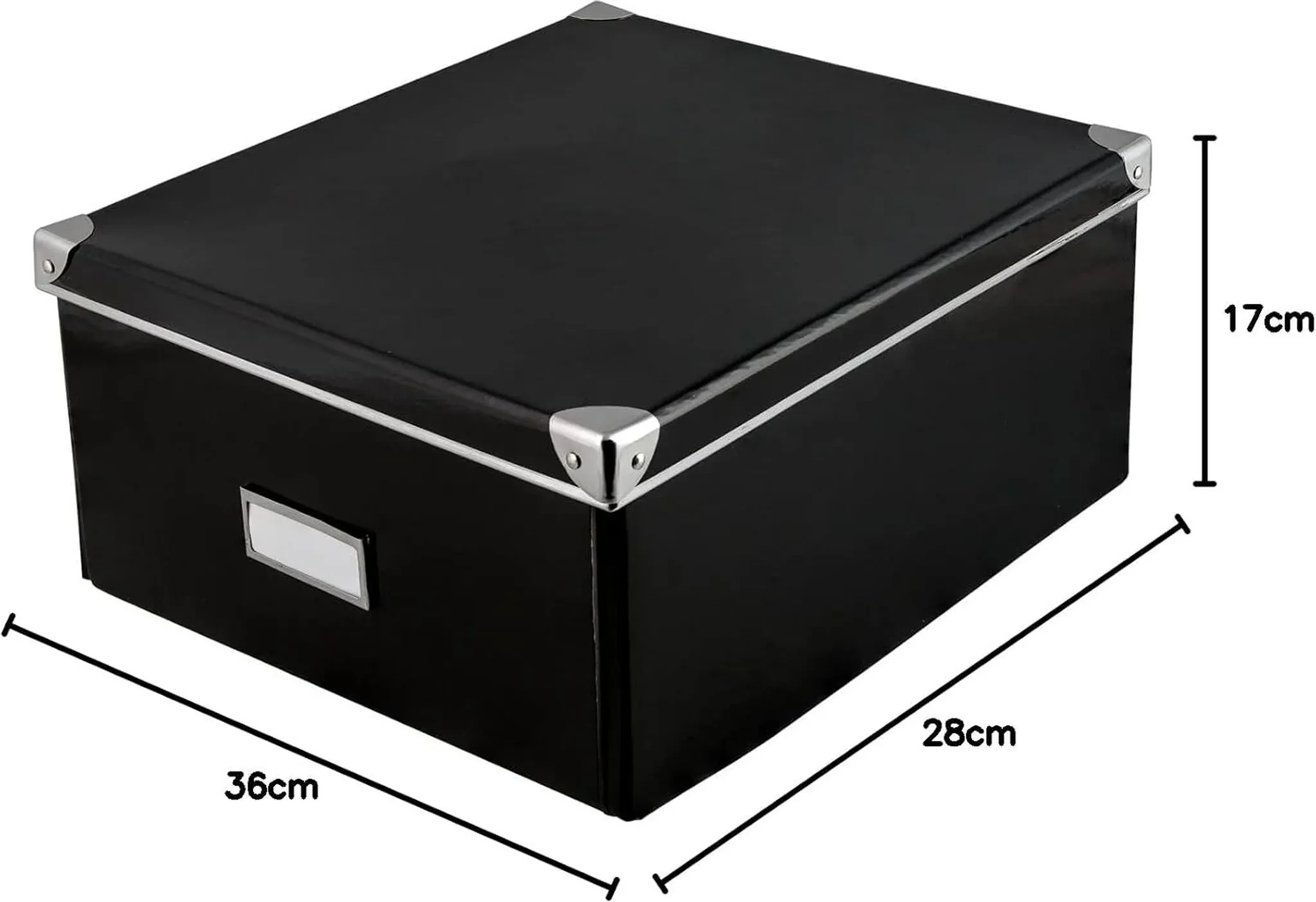 Diese hochwertige Idena Aufbewahrungsbox eignet sich ideal zum Organisieren von Dokumenten, Kleidung, Accessoires, Deko-Artikeln und vielem mehr. Dank verstärkter Metallkanten bleibt die Box formstabil und lässt sich problemlos stapeln. Das stilvolle schwarze Design passt in Wohnräume, Büro, Arbeitszimmer oder Kinderzimmer.