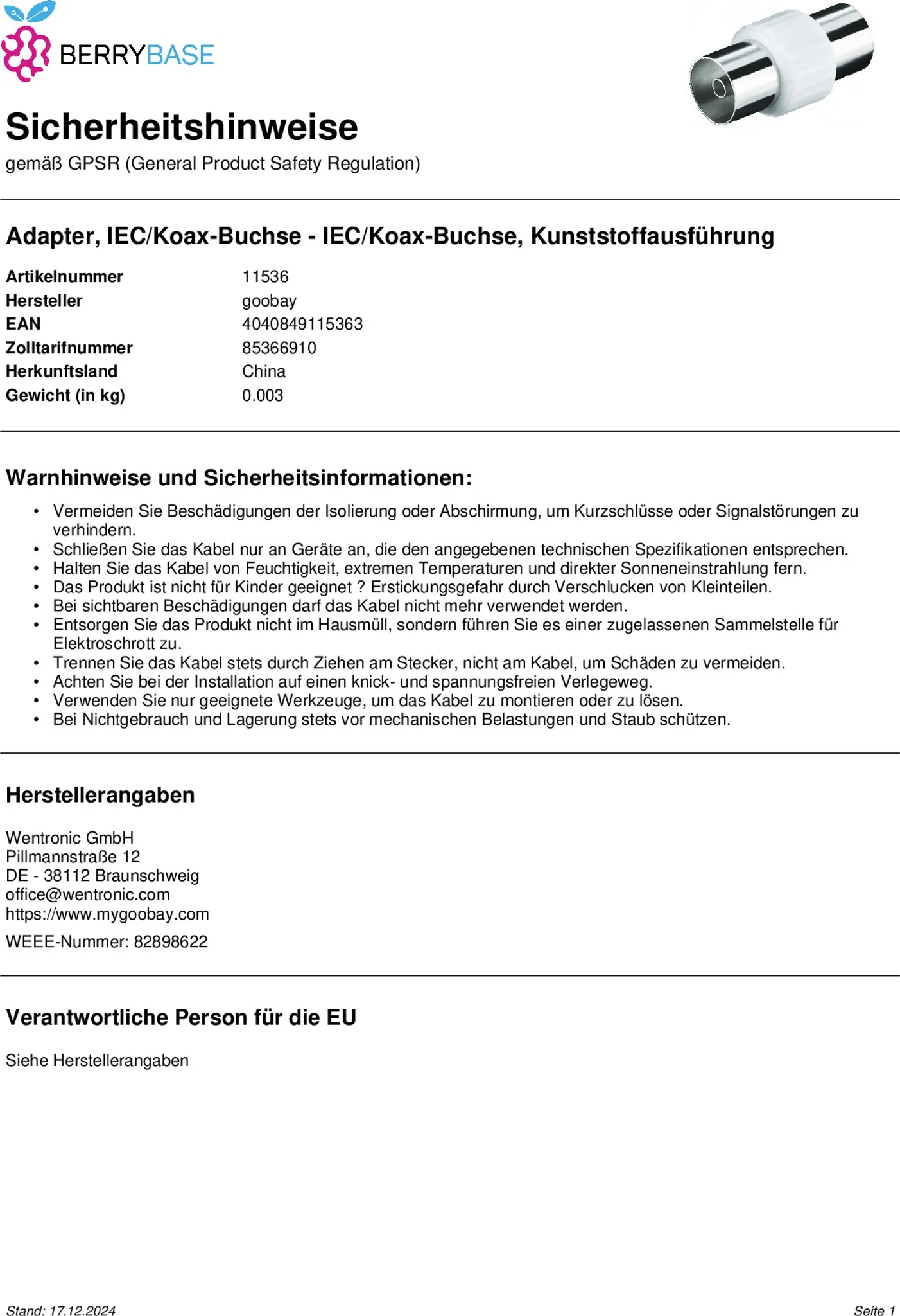 | Im Paket | 1 × Koax-Adapter (Koax-Buchse > Koax-Buchse) |