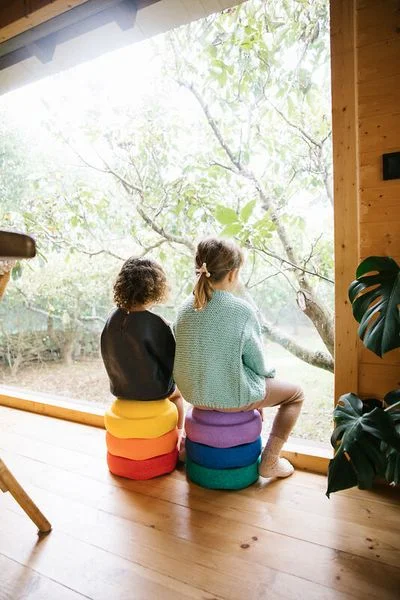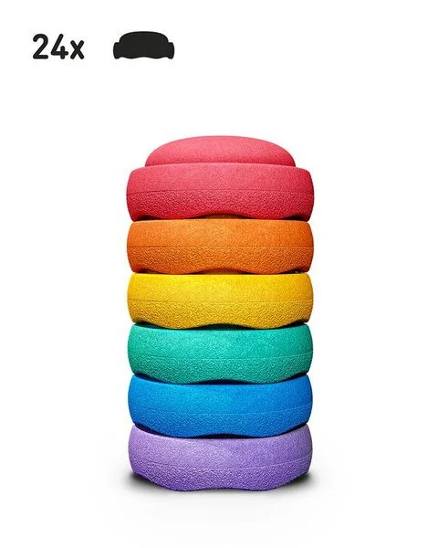 Beim Stapeln entstehen unterschiedliche Oberflächenwinkel, die immer neue Herausforderungen schaffen. Das leicht nachgebende Material fordert das Gleichgewicht zusätzlich heraus und unterstützt die motorische Entwicklung. Die sechs leuchtenden Farben greifen das gesamte Regenbogenspektrum auf und sorgen für eine inspirierende Lern- und Spielumgebung.
