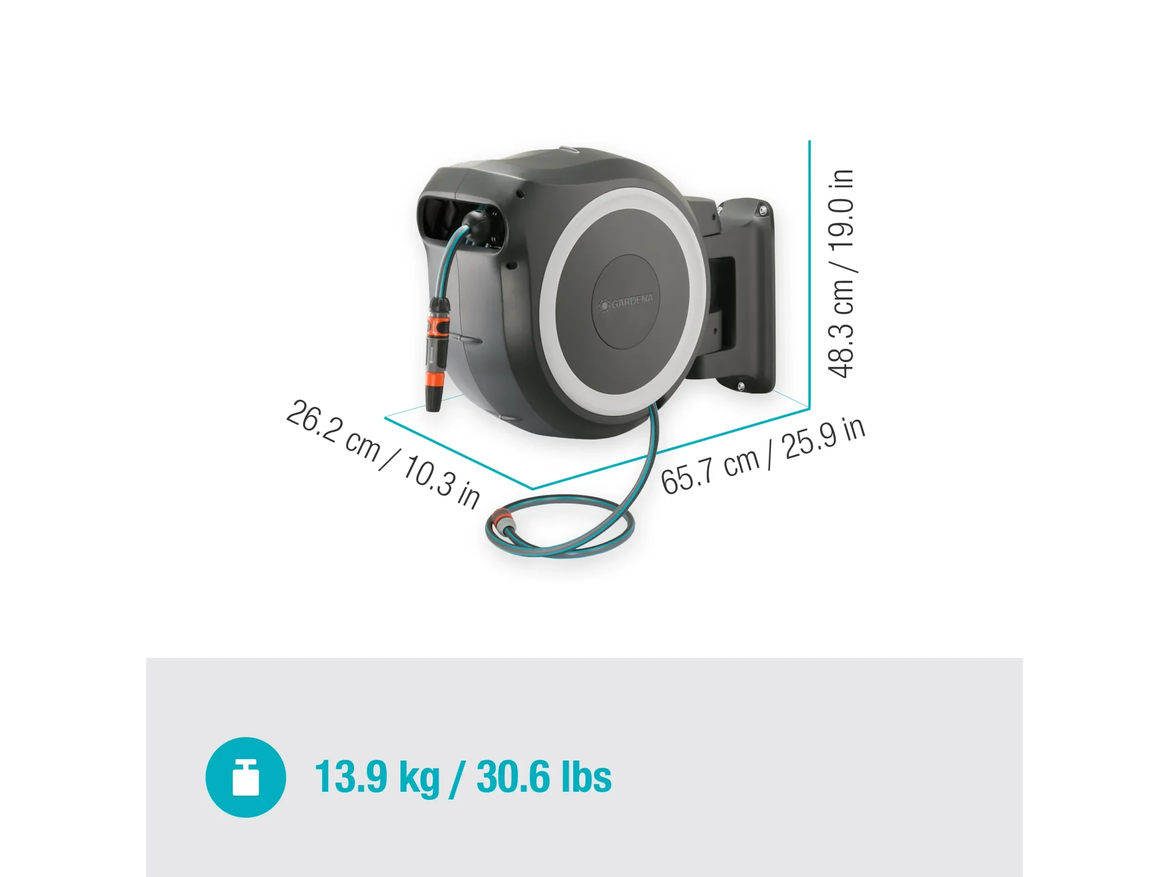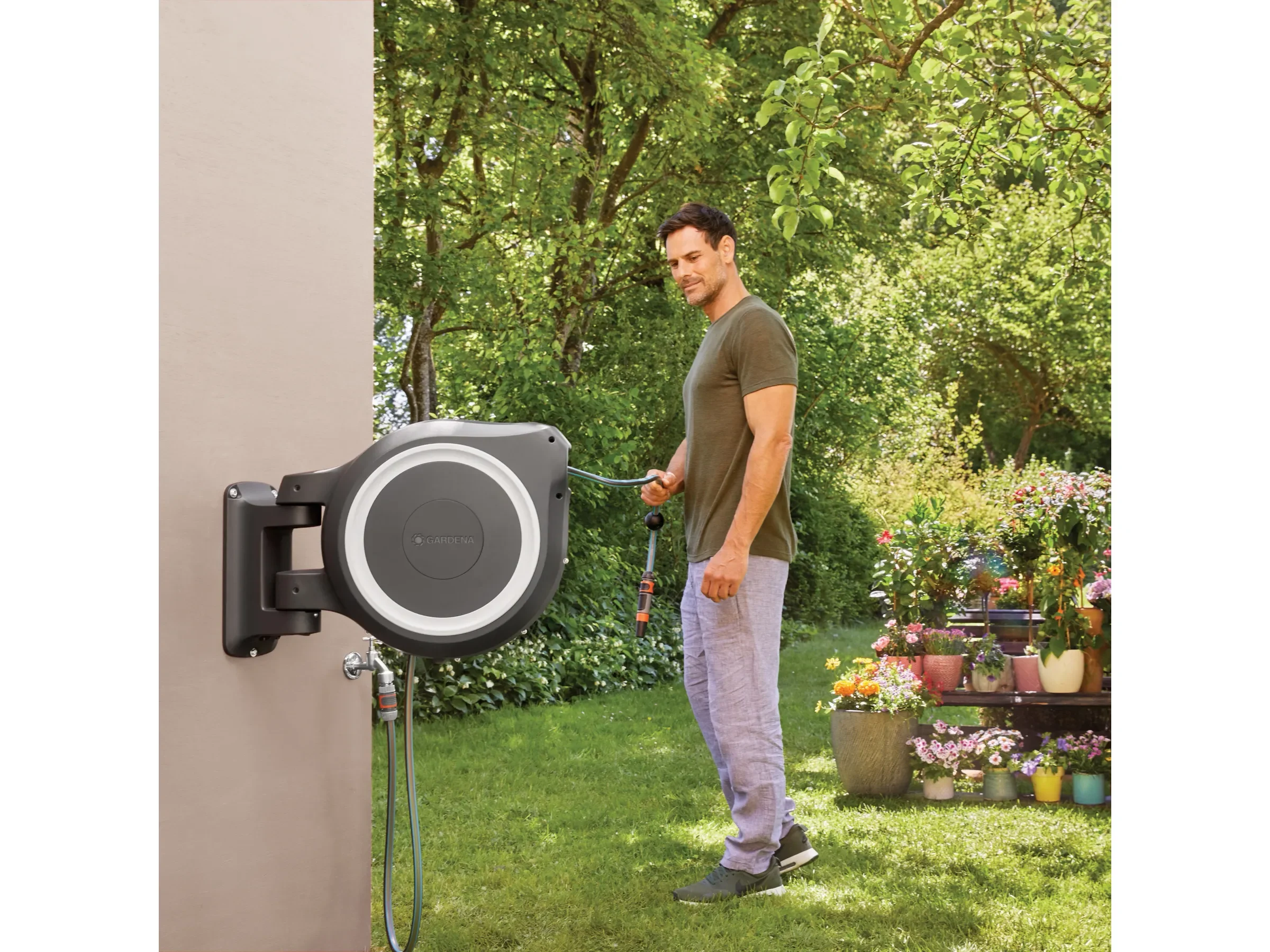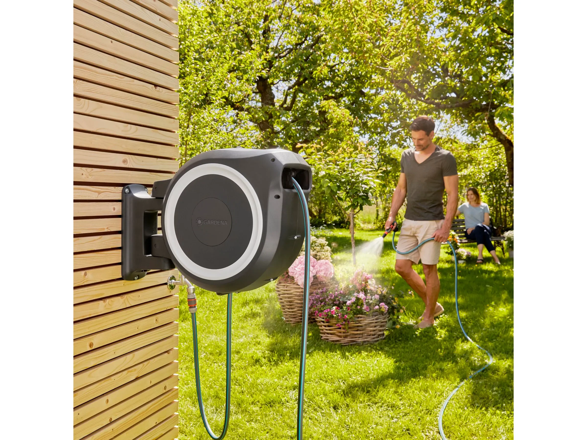 Highlights: Automatische RollControl-Aufwicklung, Arretierstopps für individuelle Schlauchlänge, integrierte Schlauchführung gegen Verdrehen, frost- und UV-beständige Materialien, platzsparende Wandlösung, zusätzlicher Diebstahlschutz.