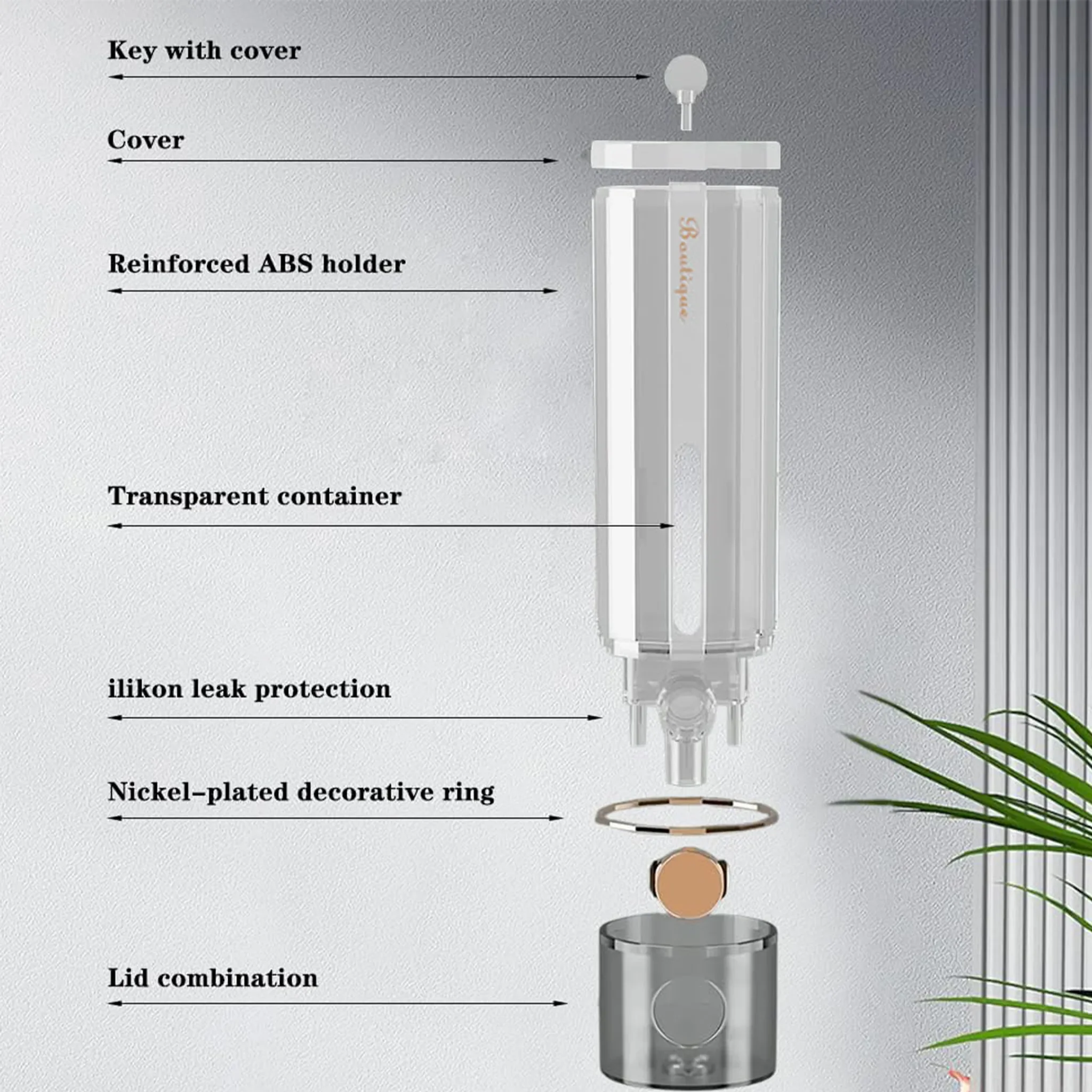 Moderner Seifenspender zur Wandbefestigung ohne Bohren. Durch das transparente Sichtfenster lässt sich der Füllstand jederzeit kontrollieren. Der auslaufsichere Pumpmechanismus gibt nur die benötigte Menge ab – sauber und sparsam. Ideal für Bad, Küche, Büro, Hotel oder Restaurant.