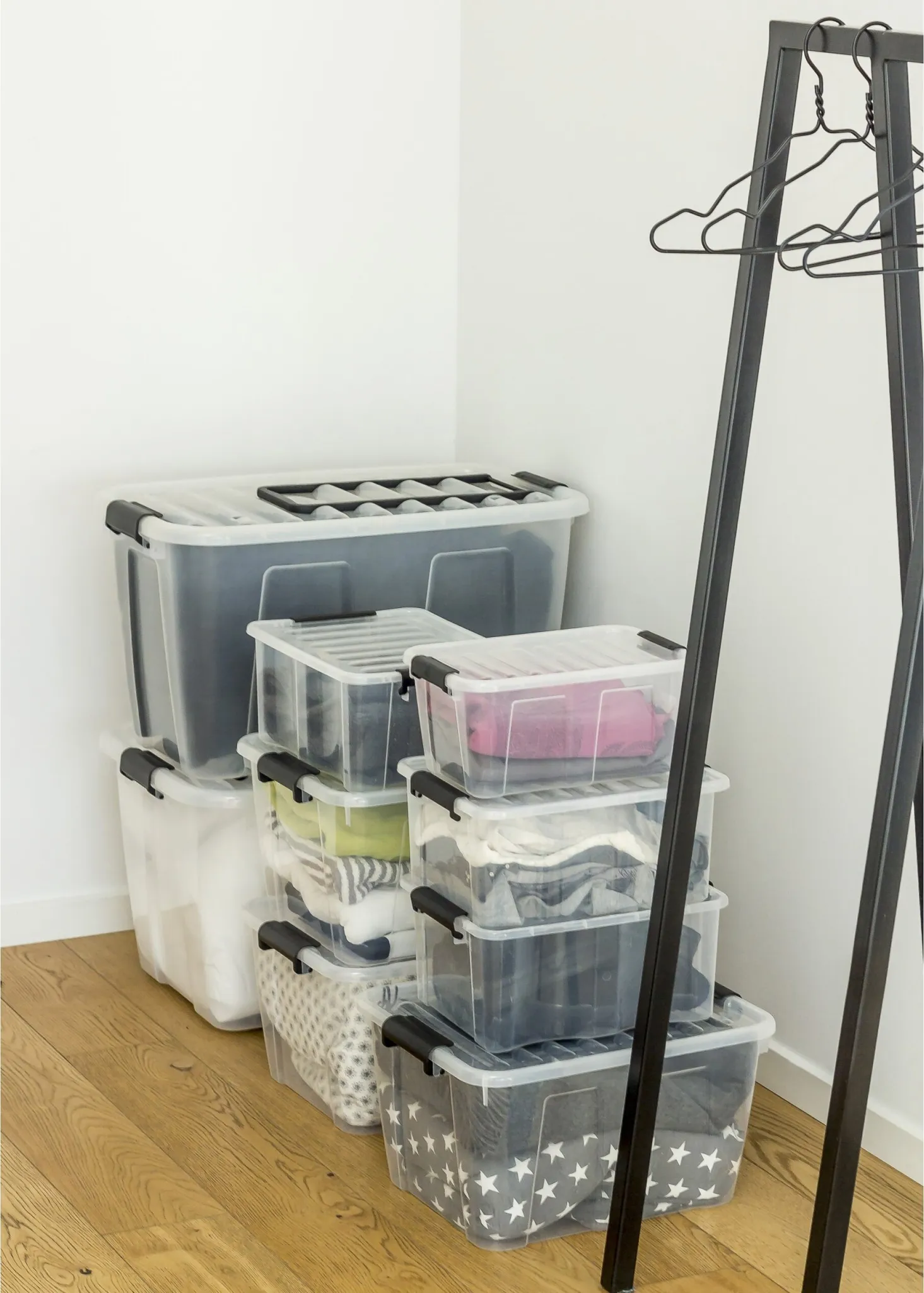 Vielseitige, stabile und stapelbare Aufbewahrungsbox mit sicherem Klickdeckel. Ideal zur Aufbewahrung von Dokumenten, Kleidung, Spielzeug, Werkzeug, Bastelmaterial und vielen weiteren Gegenständen im Haushalt, Büro, Keller oder Hobbyraum.