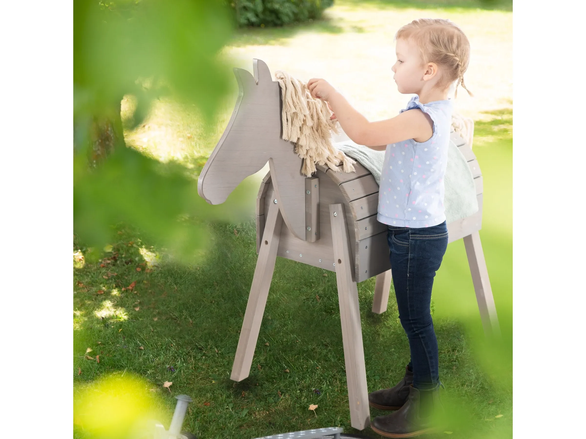 Highlights: Vielseitiges Spielgerät zum Reiten, Klettern und Voltigieren, wetterfestes Massivholz, sehr stabil durch Verstrebung, Mähne & Schweif für kreatives Styling, moderne graue Lasur für den Außenbereich.